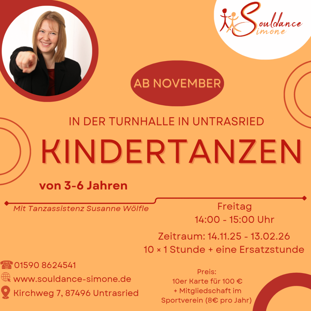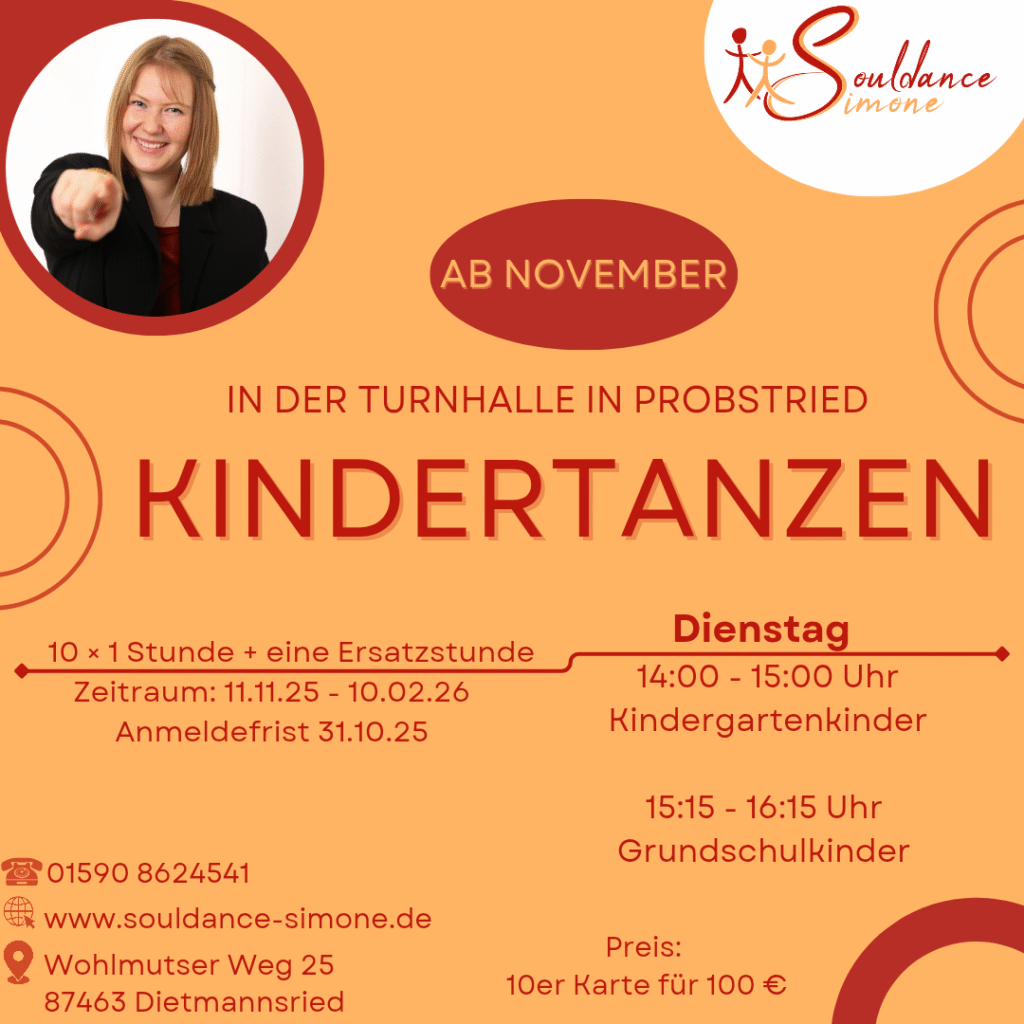 In meinen Kindertanzkursen entdecken die Kinder auf spielerische und ganzheitliche Weise die wunderbare Welt des Tanzens. Gemeinsam lernen wir erste Tanzschritte, entwickeln ein Gefühl für Rhythmus und Musik und fördern dabei Koordination, Kreativität und Selbstbewusstsein.